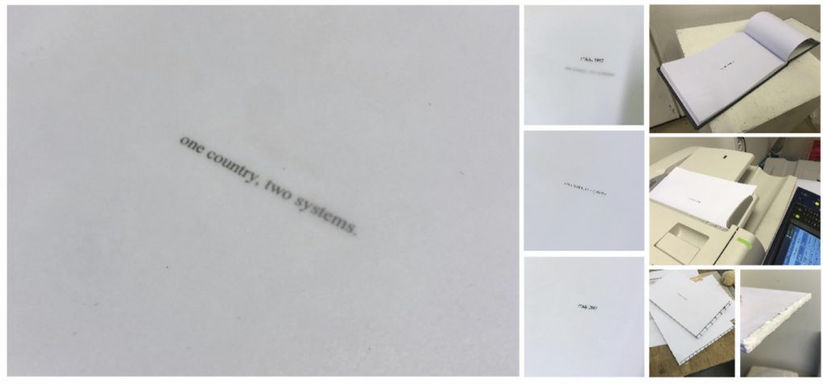 This book combined techniques of western ad eastern book binding. The content is just a sentence of ‘One country, two systems.’ I used the copy machine to keep copying the print outs, play with the idea of data degeneration in order to metaphor the future of the Hong Kong political independence. The book has 50 pages, with index of every ten years; indicating the promise by China government on Sino-British Joint Declaration exists in name only. It is just 23 years since the shift of sovereignty, Hong Kong is no longer having any independent system in economy and legislation. Western style for the coverage while the eastern binding technique applied for the inner pages, it intends to show the status of Hong Kong that the politics just want to use a democracy way to wrap a typical Chinese corrupted political means. And it reads from right to left, symbolize the fortune of Hong Kong is stepping from capitalism to communism.